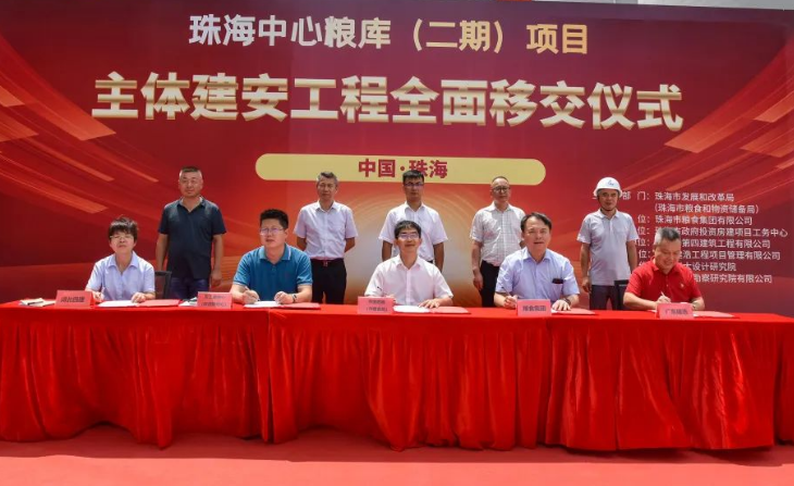 2023年8月30日,珠海中心粮库二期项目主体建安工程全面移交仪式在珠海中心粮库库区内顺利举行。市发展和改革局副局长王梦阳、四级调研员颜宪鑫,农控集团副总经理钟华,粮食集团董事长王小彬以及相关领导、项目参建单位负责人参加活动。